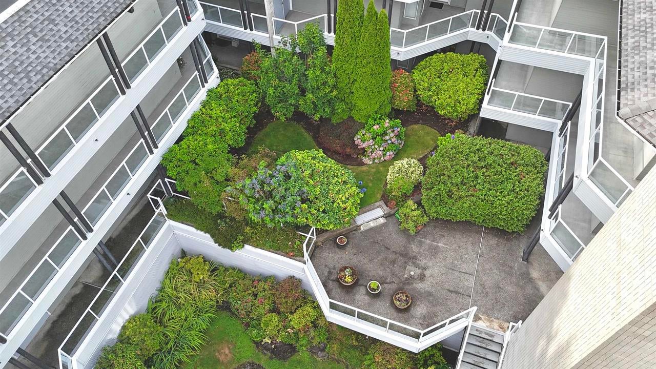 underground parking, elevator access, in-suite laundry, wheelchair access, bike room, lounge, balconies or ground-level patios, and a beautiful garden area with fish pond. Some homes also feature vaulted ceilings and generous in-suite storage.