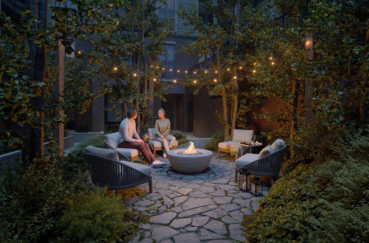 Fitness gym, multi-function room, large courtyard with lounge space, lawn area, and children’s play area.